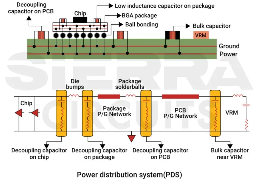 图解:VRM VDDC 热点达 104.8°C、107.3°C,充分说明 board-level 发热不可忽视。3. 完整热 profile 的核心:PDN(Power Delivery Network)原理PDN 是芯片到电源的整个路径,电容、电感在其中起滤波、稳压作用,但也同时发热。TTV 必须按照 NVIDIA 提供的 PDN loss model 精准模拟。经典 PDN 原理图(显示电容、电感在电源路径上的位置和发热机理):