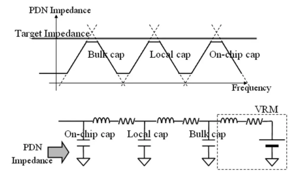 图解:从芯片到 VRM 的多层去耦电容 + 电感网络,GB300 TTV 会在对应位置放置真实或等效加热元件。另一张 PDN 阻抗与电容布局示意图(高频下电容、电感的作用):