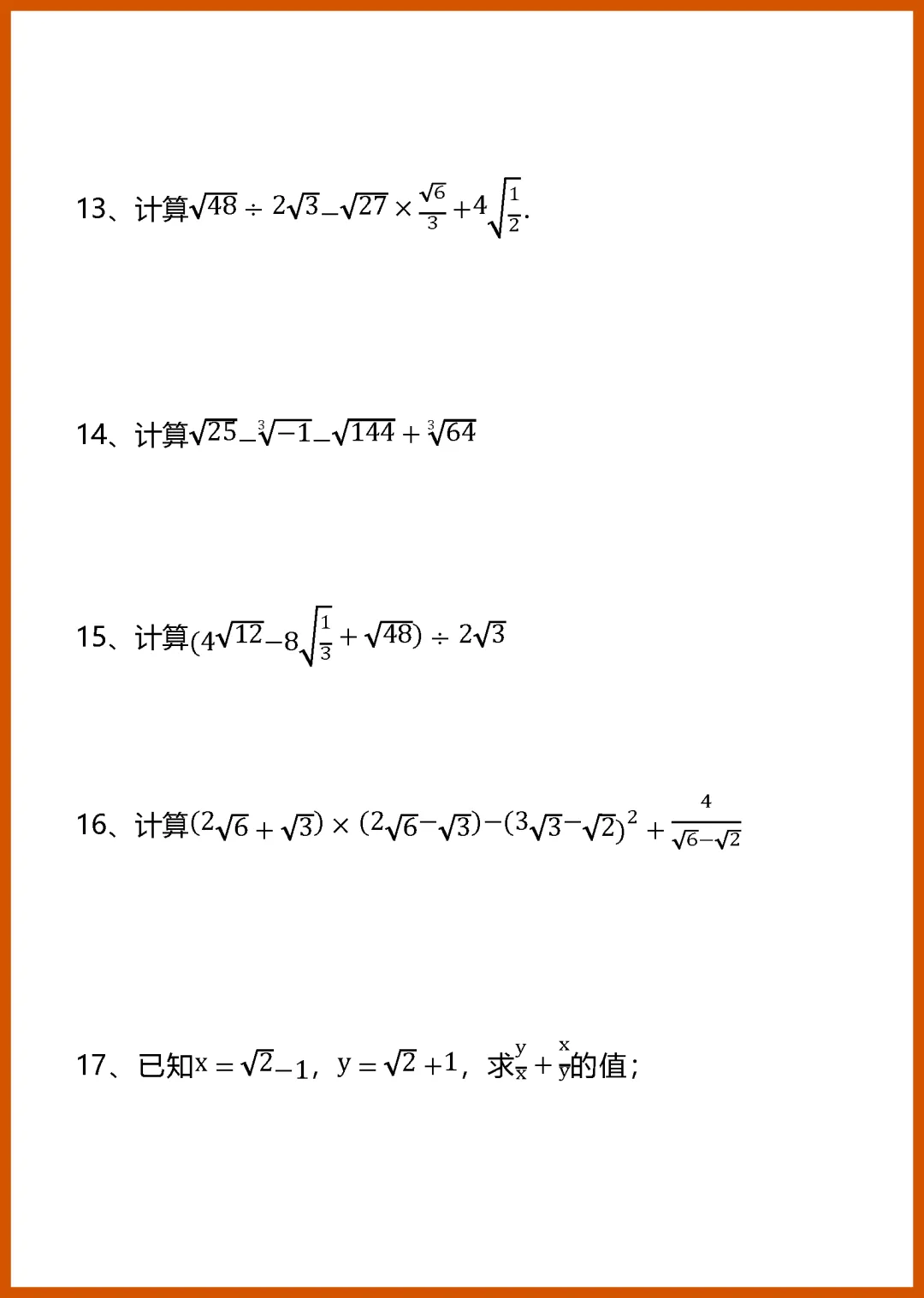家长们注意啦!2026 新版八年级下册数学第一次月考专项练习来了,本次分享的是二次根式混合运算专题,共 12 页精编内容。资料紧扣最新考纲,涵盖各类典型题型与易错点解析,旨在帮助孩子攻克计算难关,提升解题速度与准确率,为月考拿高分打下坚实基础。别让粗心丢分,赶紧下载打印,让孩子趁热打铁练一练,轻松应对新学期第一次大考!