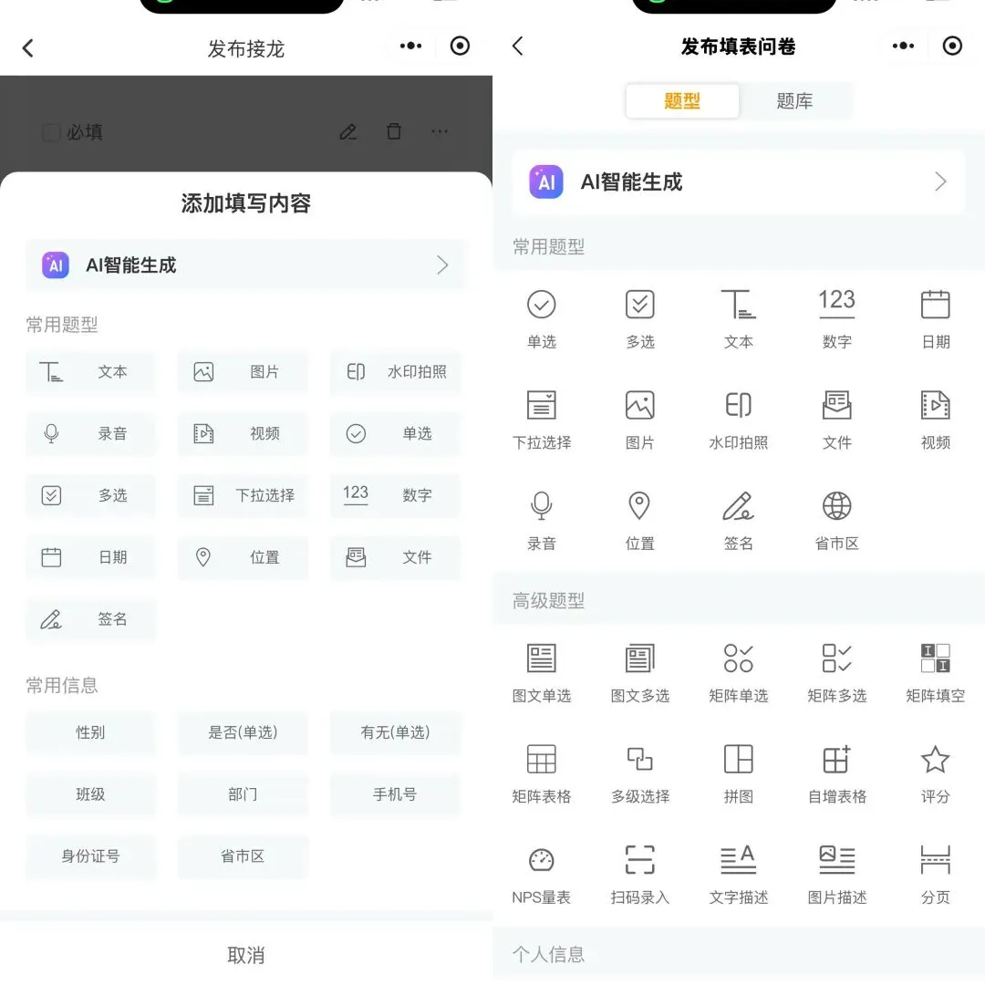 它支持问卷调查、考试测评、投票评选等多种应用场景,有十多种题型和七大类题库,还能和社交场景结合,方便在社交环境里传播和回收数据。