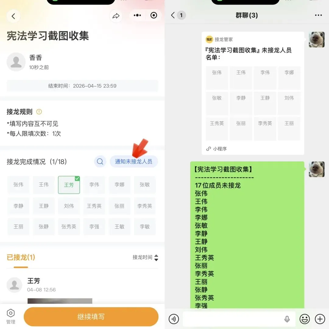 接龙管家首创的预置名单功能,给要统计信息的人带来了很大的方便。提前导入成员名单后,已经提交信息的人员会自动高亮显示,没提交的就保持灰色,收集进度会实时更新。不用手动去核对,能节省 90% 的核对时间。