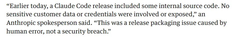 Anthropic官方已确认这是一次“发布打包环节的人为失误”,并非黑客入侵或安全漏洞,无任何客户数据或凭证泄露。