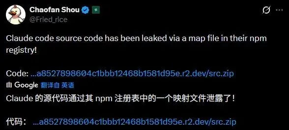 安全研究员Chaofan Shou(X账号@Fried_rice)在常规监控中率先发现这一异常,并在3月31日凌晨4点23分左右于X平台发布提醒,附上了直接下载链接。