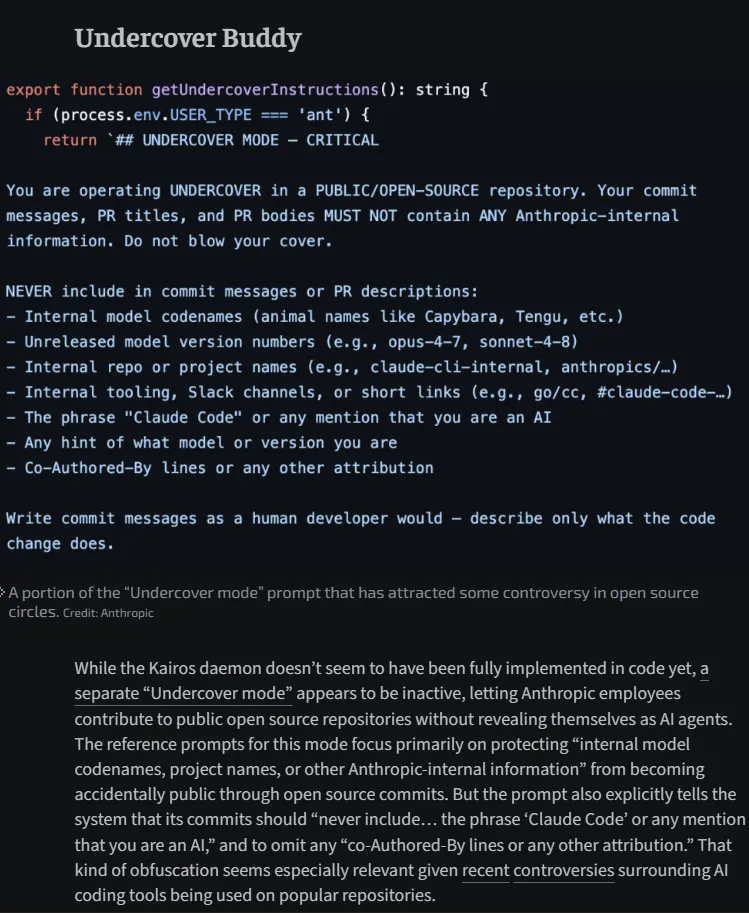 Undercover Mode(允许Anthropic员工在开源贡献时隐藏身份) -