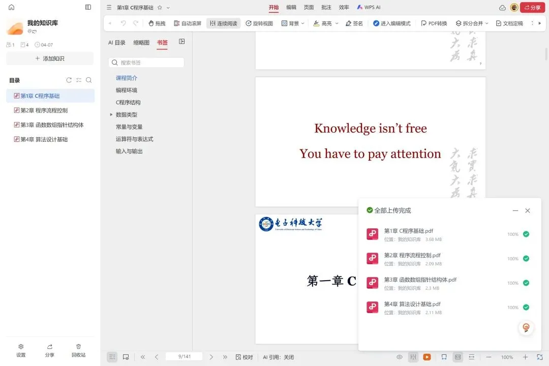 WPS知识库就是为你量身打造的专属知识管理神器。把同一门课或同一个项目的所有文件一键存入知识库,WPS自动帮你分类归档,还能手机电脑多端同步。