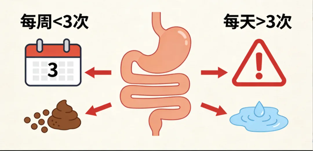 排便频率异常:每周少于3次,或每天超过3次 -