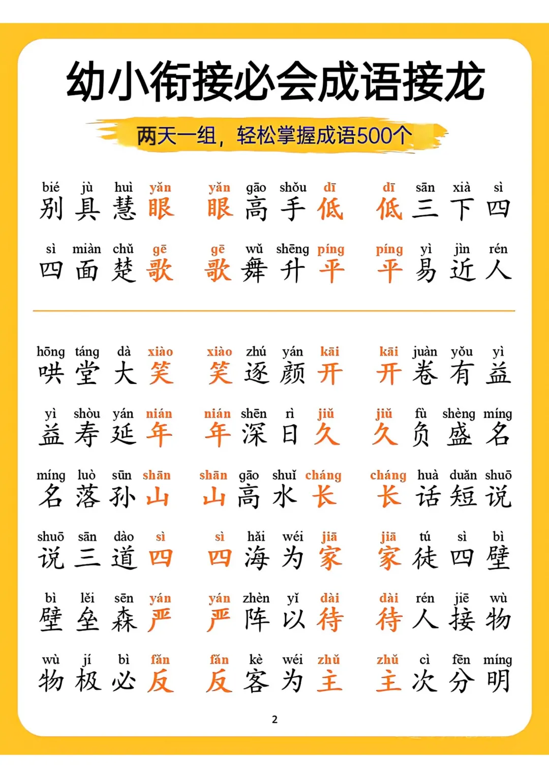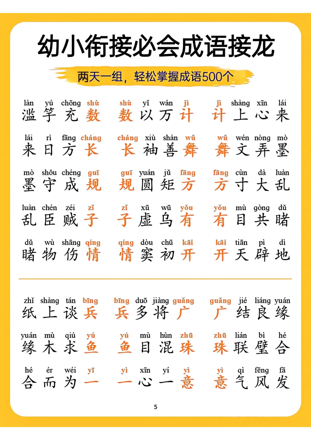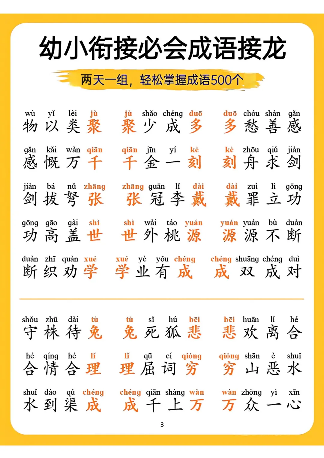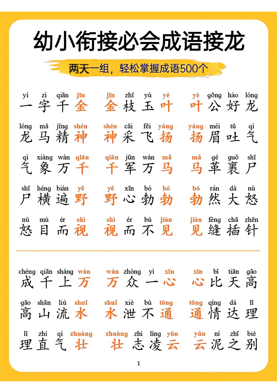 幼小衔接必会成语接龙来啦!精选适合此阶段孩子的成语,以接龙形式编排。既能让孩子积累成语,提升词汇量,又能锻炼思维反应。电子版可下载,需要的家长可以打印出来,助力孩子轻松完成幼小衔接,为小学学习添彩。(温馨提示:文末有资料获取方式)
