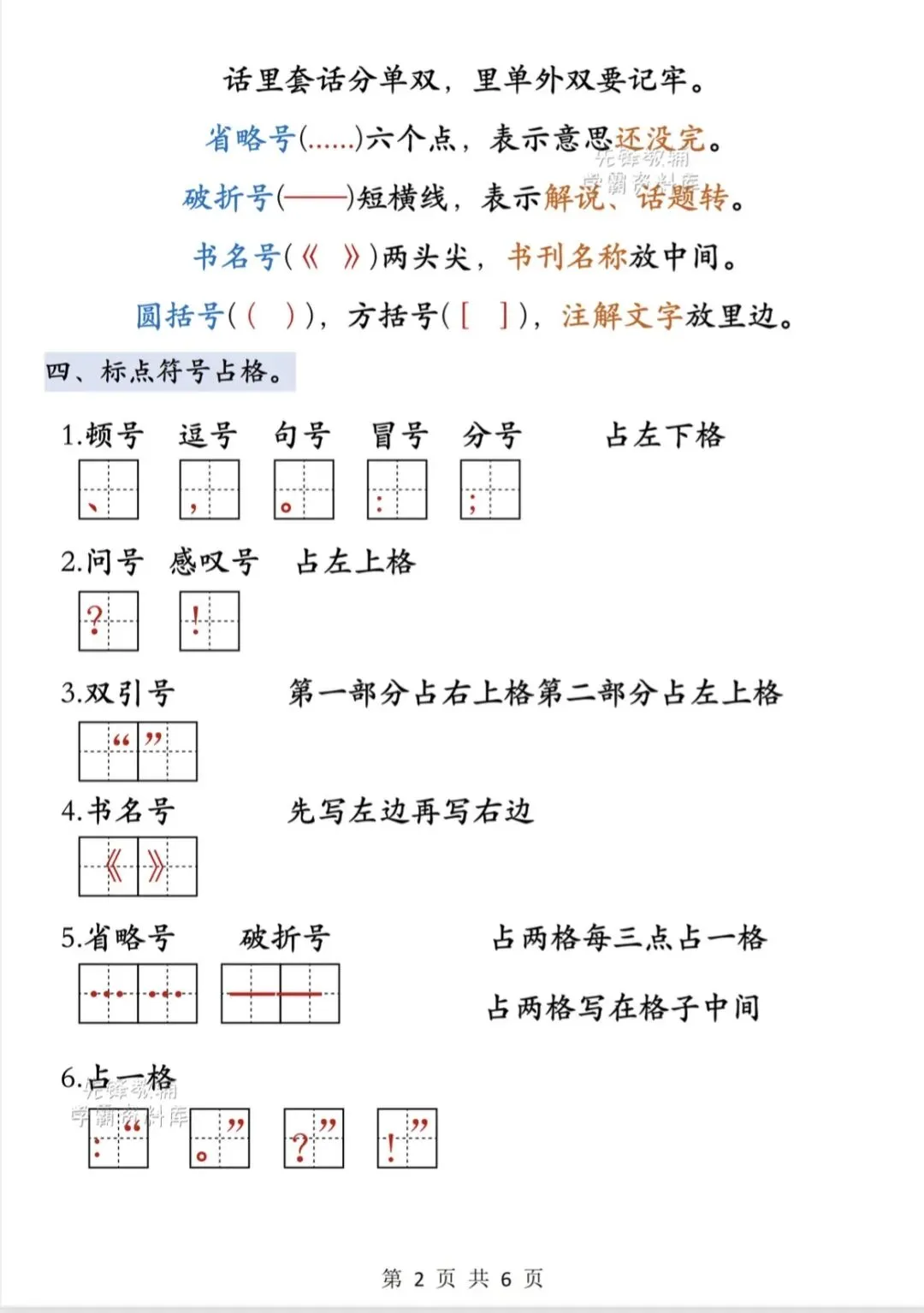 标点分点号(句逗顿分冒问叹)和标号(引、省、破、书名号等)。有顺口口诀,好记好用。书写有占格规则,标点不顶行首。常考:句内停顿用逗号,并列词语用顿号,问句用问号,感叹用叹号,对话用冒号引号。