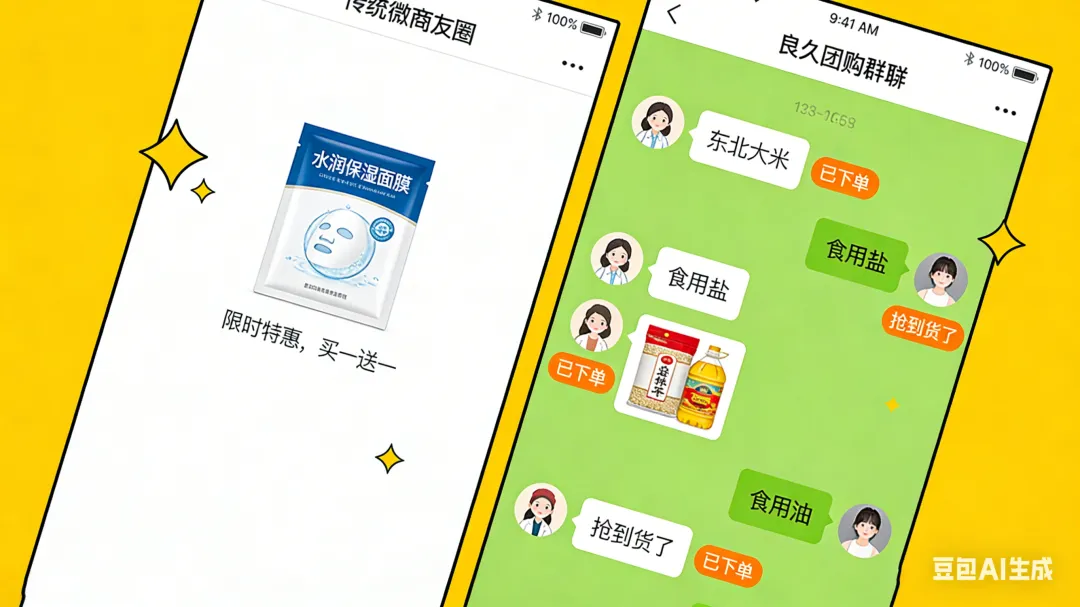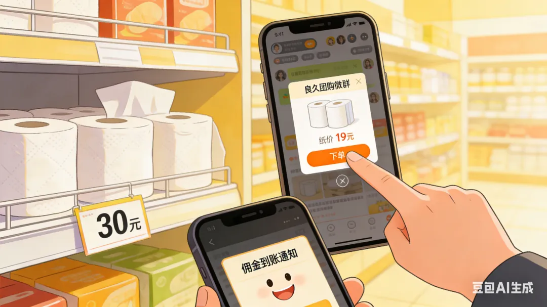 第一,全品类布局,用高频打低频。传统微商大多聚焦单一品类,比如一款面膜、一款护肤品,复购率低、用户粘性差;而良久团购主打柴米油盐酱醋茶等民生刚需品,每天都要用、每天都要买,一个纸巾、一箱牛奶,就能让用户养成在群里下单的习惯,复购率高达90%以上。