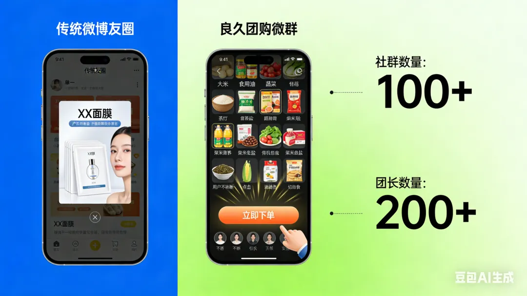 很多人误以为良久团购的对手是美团,但其实不然——美团的对手是饿了么,拼多多的对手是淘宝,而良久团购的真正对手,是传统微商和传统社区团购。