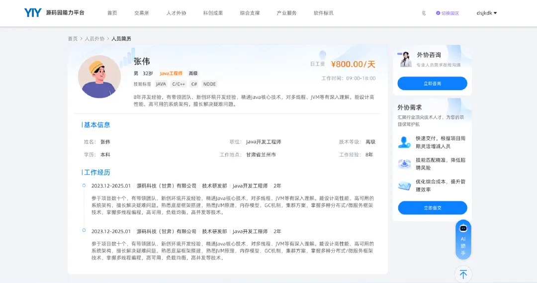 源码园能力平台「人才外协」模块正式上线,立足甘肃、辐射西北,专为国企 IT 企业、地州市集成公司、投标中标单位打造精准、高效、安全的技术人才对接服务,让你按需用人、灵活协作、全程可控。