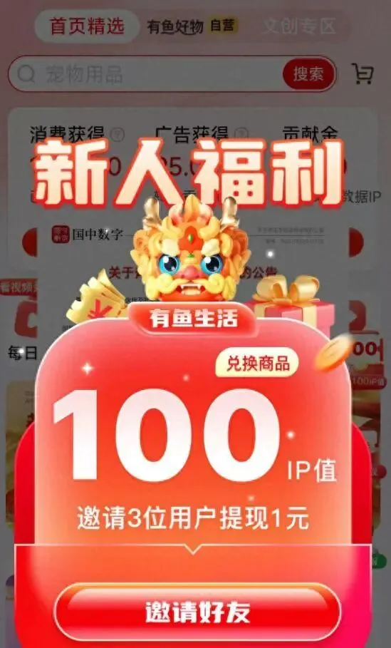 该APP设置了复杂的奖励机制:新人注册可提现3元,邀请好友、观看广告、每日签到等均可获得贡献金,积累到一定数量可兑换商品或“文化数据IP(品牌形象)”。“有鱼生活”平台宣称这些IP是具有增值潜力的数字资产,可交易兑现。