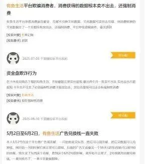 然而,《消费日报》记者调查发现,网上关于该APP的“赚钱攻略”与大量投诉并存。在黄金大涨之际,有网友甚至称平台可以有免费的黄金“撸”:“‘撸’十来克黄金能变现七千多块钱,还有长篇分享内容称,自己靠有鱼生活实现了‘翻身买车’。”而在黑猫投诉等平台上,消费者反映平台存在强制消费、广告收益无法提现、文化数据IP长期无法成交等问题。有用户花费19.9元购买贡献金资格后,需每日观看4个视频,且后续兑换流程复杂,推荐人也难以解释清楚。