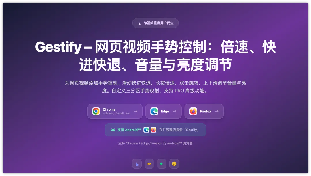 今天给大家分享一款超硬核的浏览器插件,这款插件叫Gestify,一款网页视频助手,装了这款插件之后,你以后浏览任何网页视频的时候就可以为网页视频添加手势控制。支持电脑端和手机端。