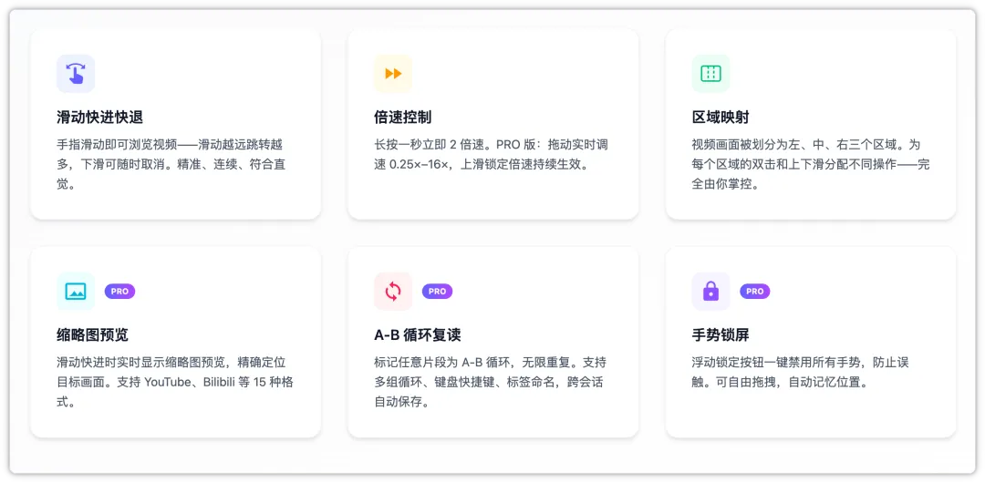 滑动快进快退,长按倍速播放,双击跳转,上下滑调节音量与亮度。