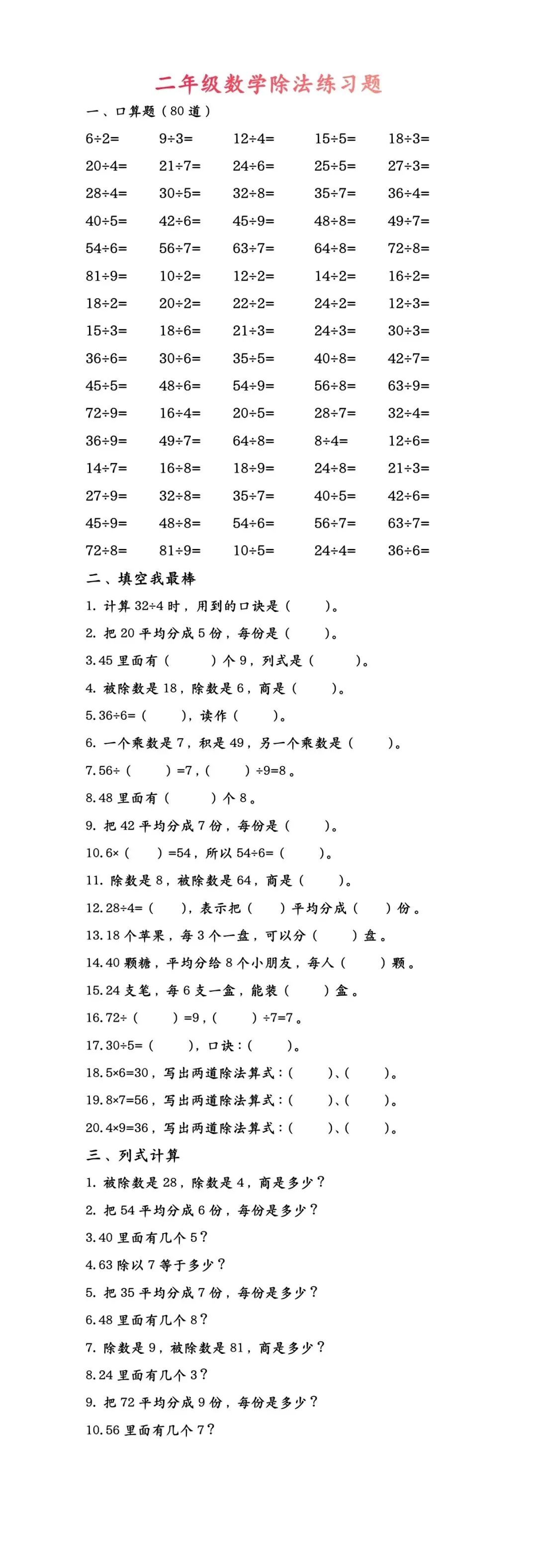 二年级数学|表内除法专项练习(可直接打印)