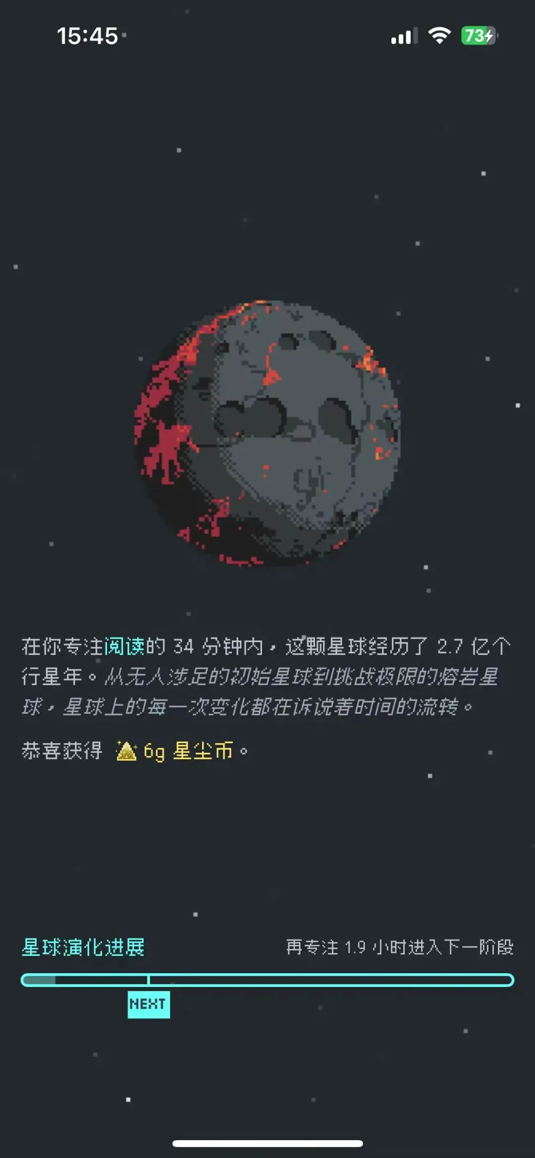 这款也是跟番茄钟差不多的专注类 APP,同类软件虽然很多,但我还是推荐一下。主要是里面的星球设计很合我口味,能满足常见的养成爱好。用法很简单,设好目标开始计时,专注时间够了,星球就会进化升级,最后能养成很漂亮的星球。