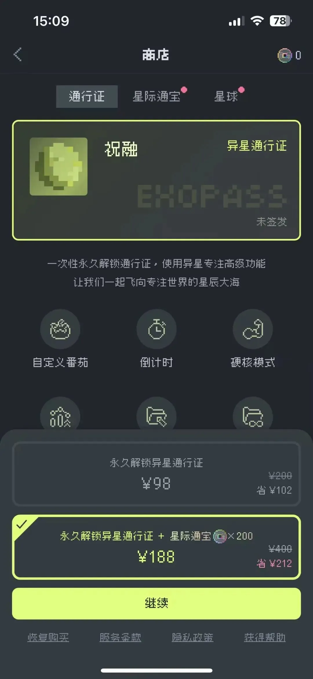 不过收费不便宜,一年 98 块,能解锁倒计时、硬核模式、自定义项目这些,也能直接花钱买新星球外观。