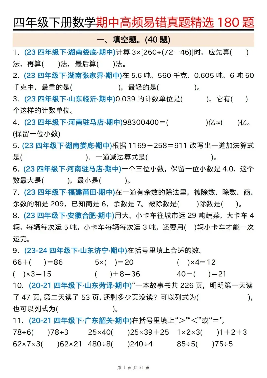 可下载丨四年级下册数学期中高频易错真题精选180题空白+答案50页,电子版可打印