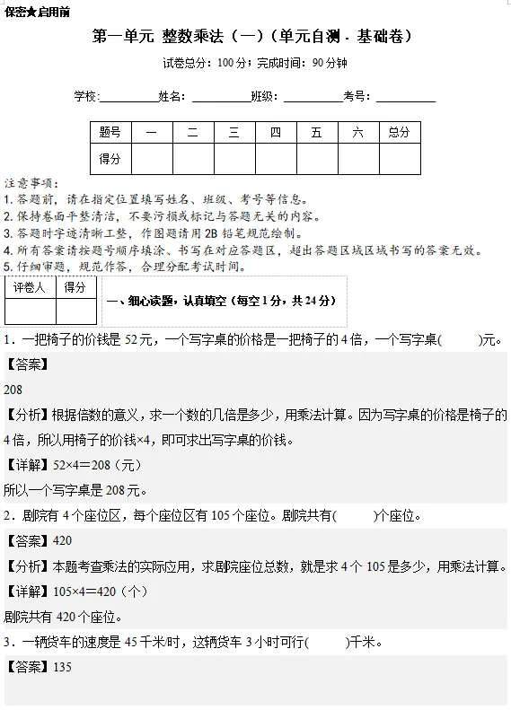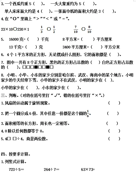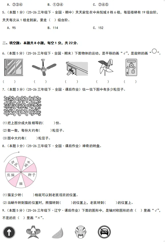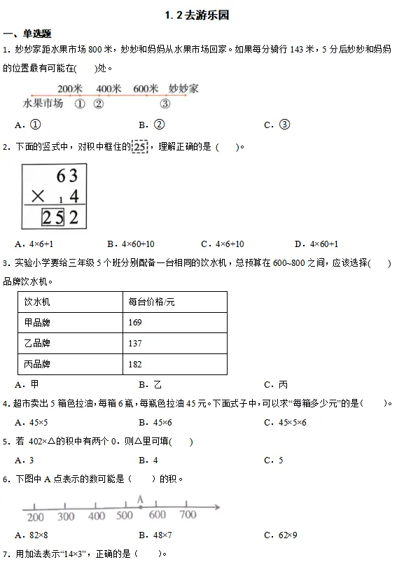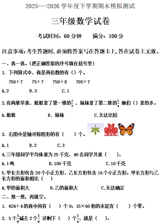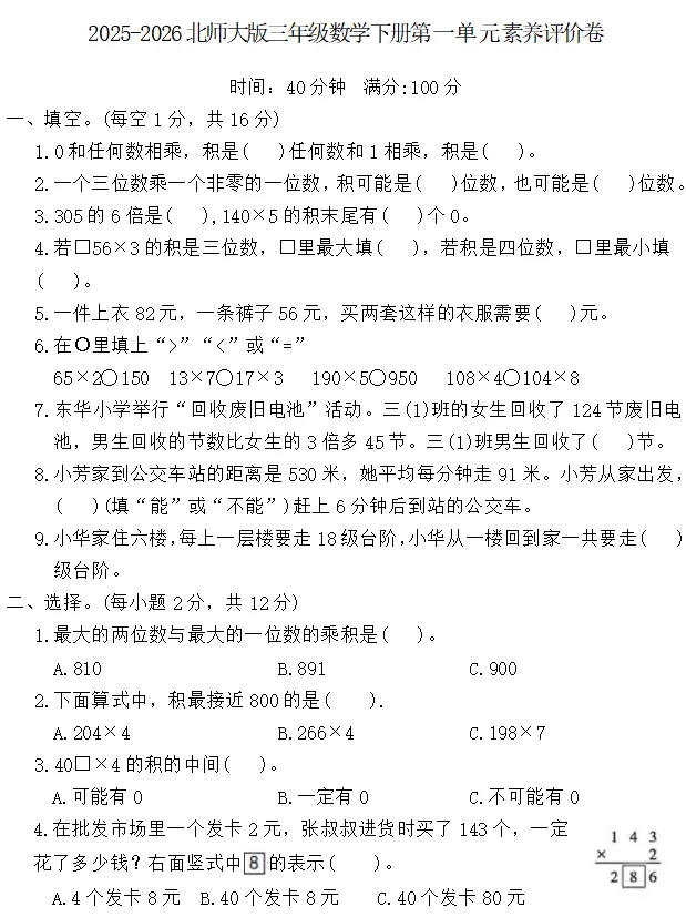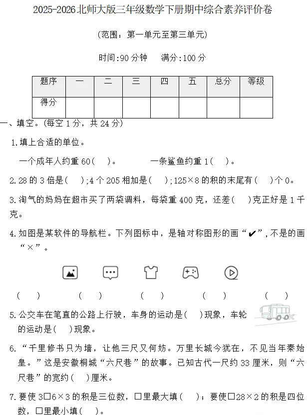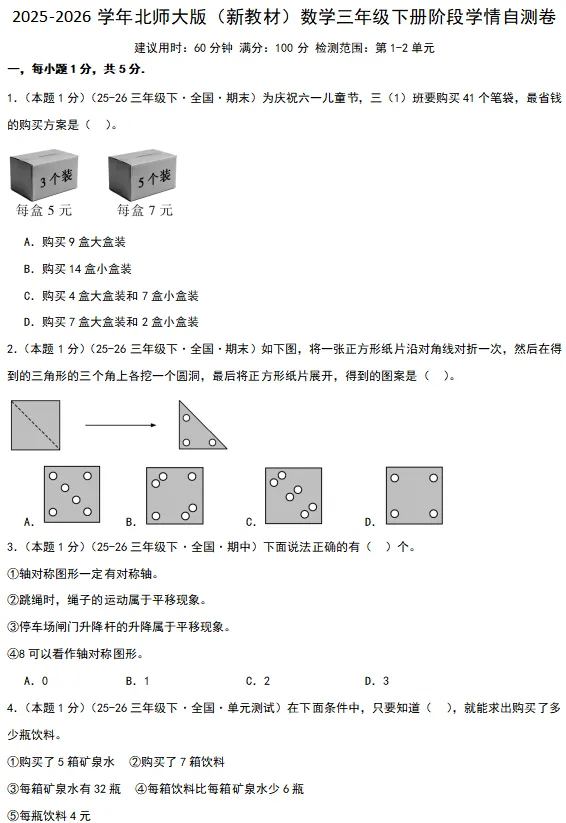 【电子版】2026春 北师大版小学三年级数学下册(同步练习+单元测试+期中测试+期末测试+月考试卷)全套下载 可打印