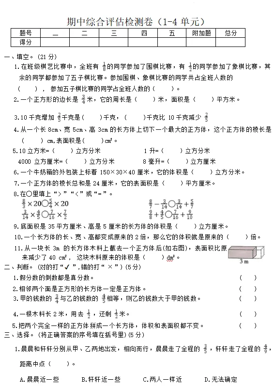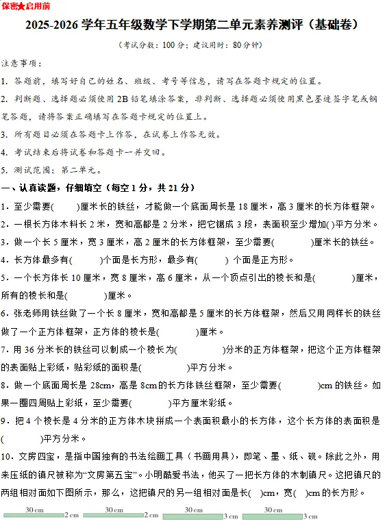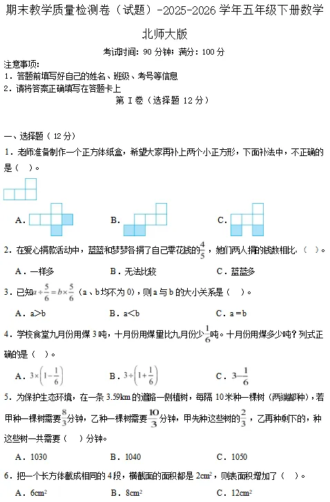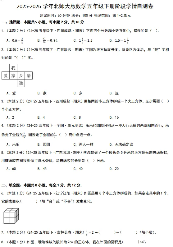 【电子版】2026春 北师大版小学五年级数学下册(同步练习+单元测试+期中测试+期末测试+月考试卷)全套下载 可打印