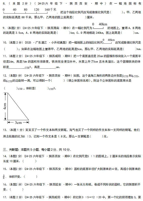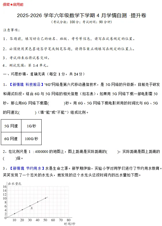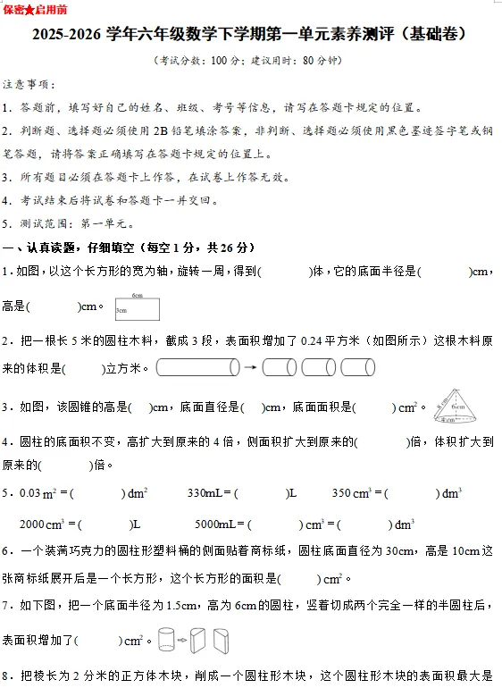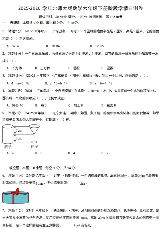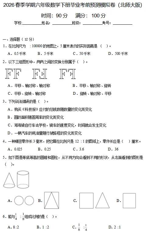 【电子版】2026春 北师大版小学六年级数学下册(同步练习+单元测试+期中测试+期末测试+月考试卷)全套下载 可打印