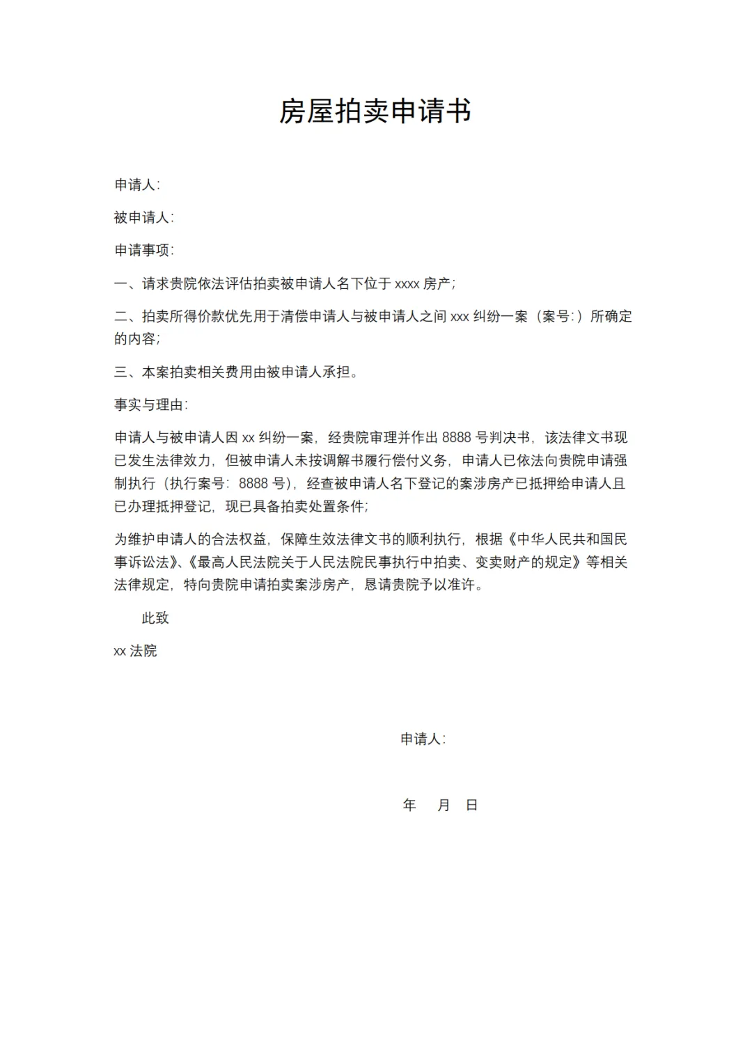 房屋拍卖申请书模板,WORD文档电子版,可免费下载打印