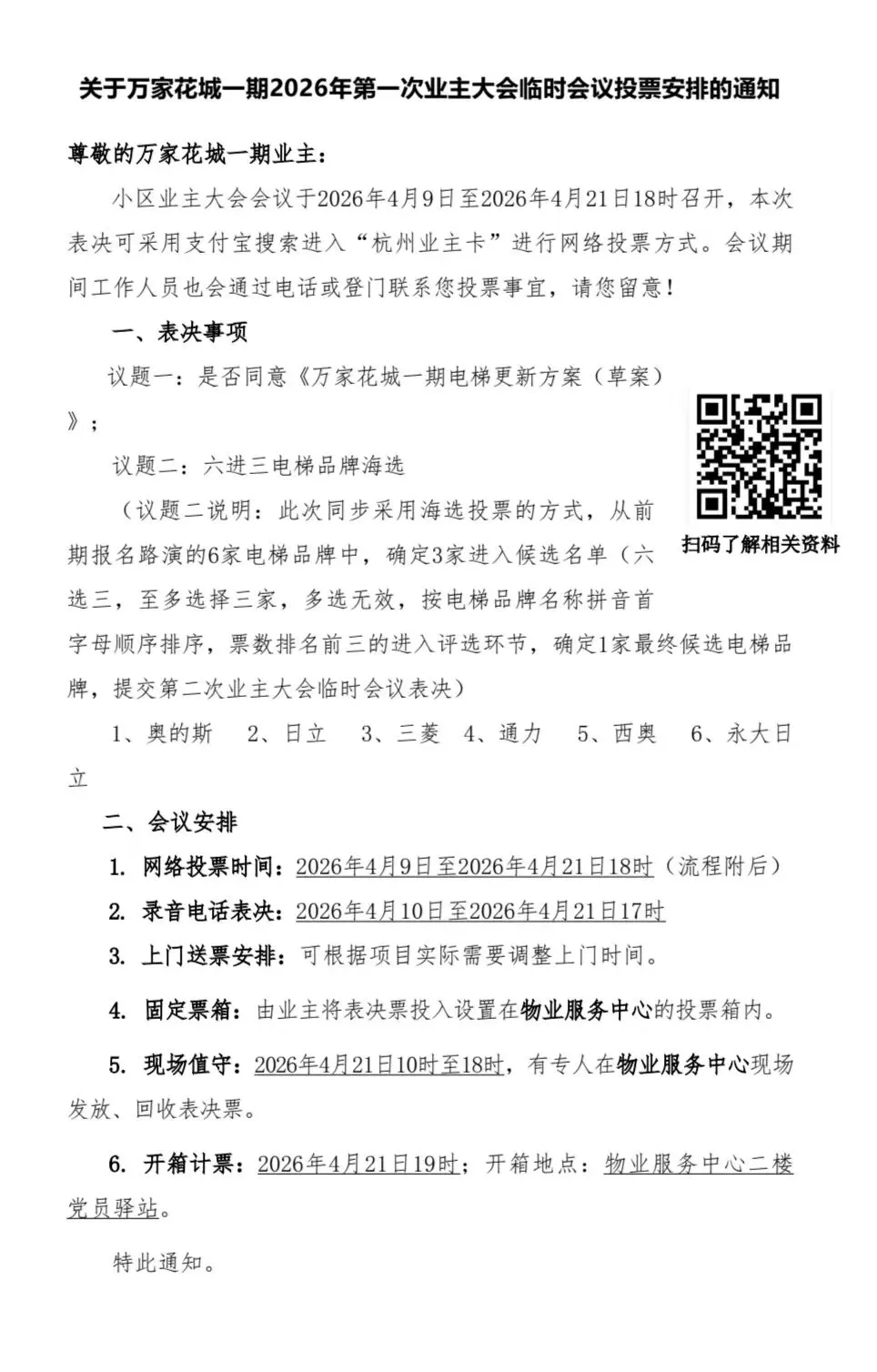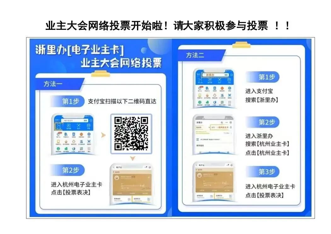 尊敬的万家花城一期业主 ,您好!小区2026年第一次业主大会临时会议于2026年4月9日至4月21日18时召开,表决共计两个事项,可采用支付宝搜索进入“电子业主卡”或浙里办APP进入“e房通”进行投票的投票方式。会议期间工作人员也会电话或登门联系您投票事宜,请您留意!
