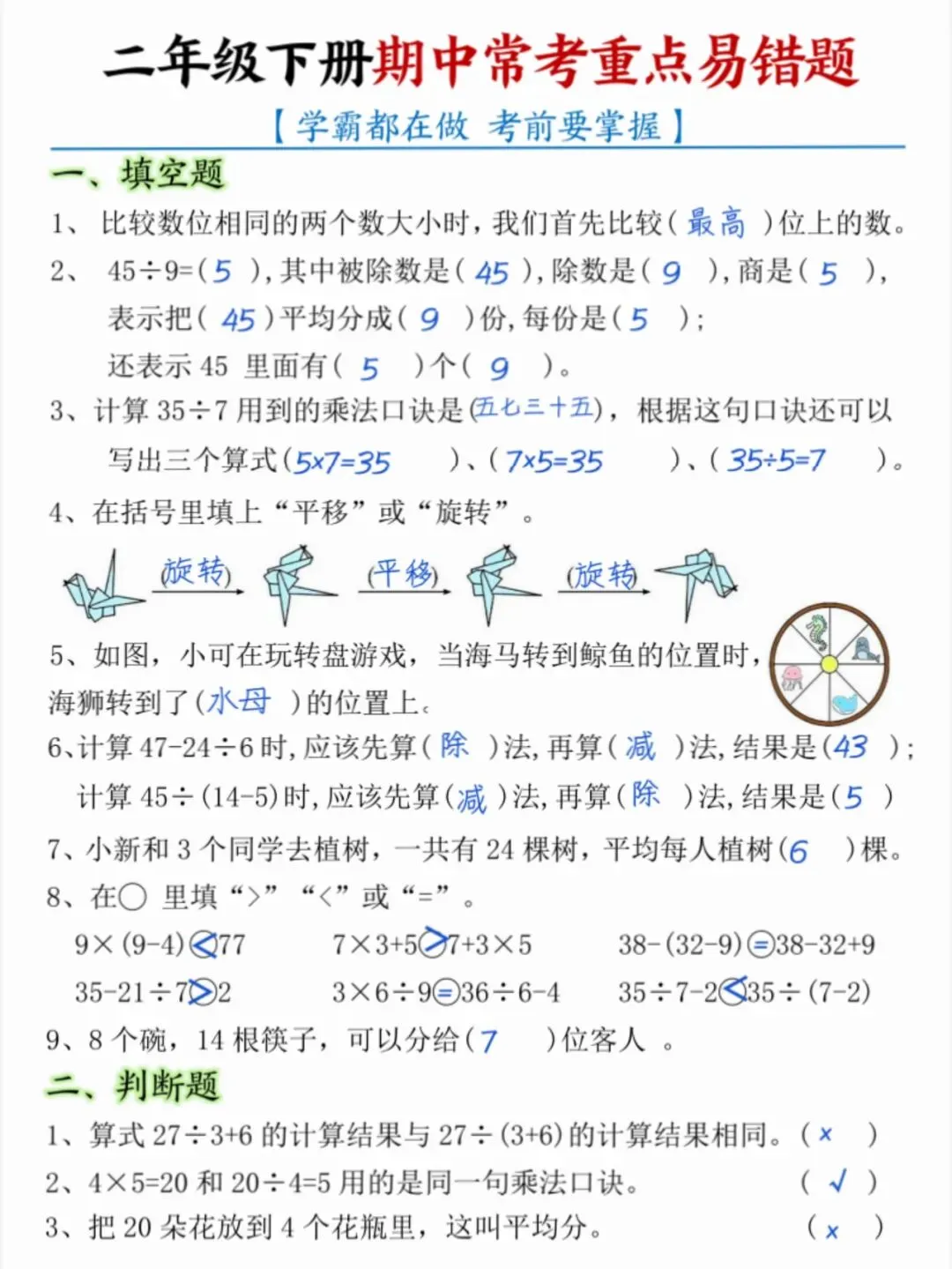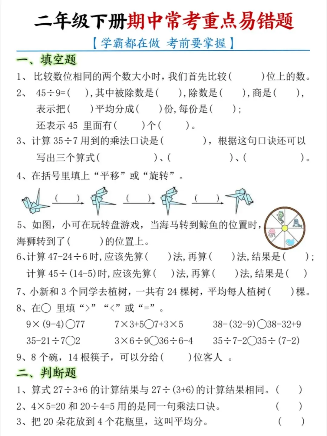 今天给大家分享:26春新版二年级数学期中常考重点易错题,一共8页。