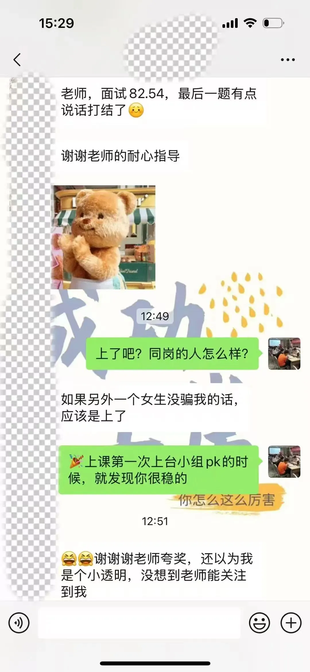 (四)针对性提升,独创五轮练习方式,有效提升开口能力。每次练习都有老师一对一精细化点评根据学生基础及特点,根据回答内容来结合实际,调整课程进度。逐步纠正问题,针对性提升明显,让每个人找到擅长的面试风格,在考场上发挥最佳状态。