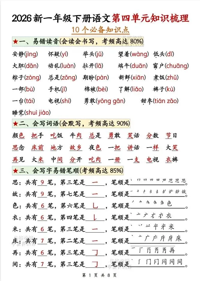 今天给大家整理了2026新一年级下册语文第四单元考点归纳+空白,转发给朋友或班级群,受益更多人,帮助孩子学习!