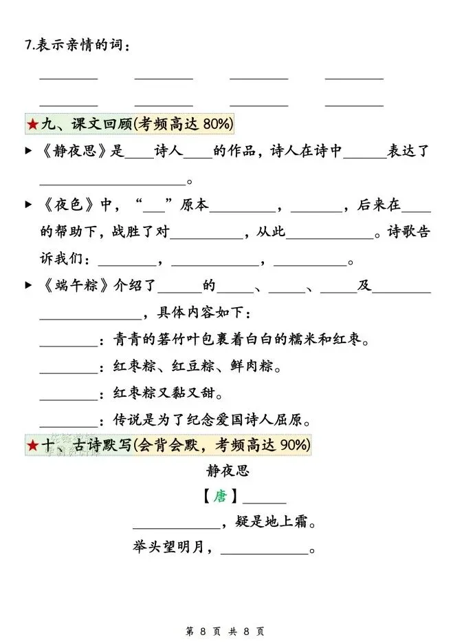 文末免费下载|2026新一年级下册语文第四单元考点归纳+空白