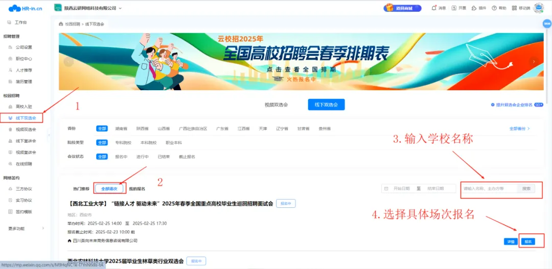 (二)用人单位注册并登录云校招平台后→后台点击“招聘面试”→点击“校园招聘”→点击“线下双选会”→搜索“广州软件学院”→选择【4月21日“万企进校园”活动——“才聚从化·业创湾区”智数产业人才双选会】场次点击“报名”→填写职位等信息→提交等待审核。