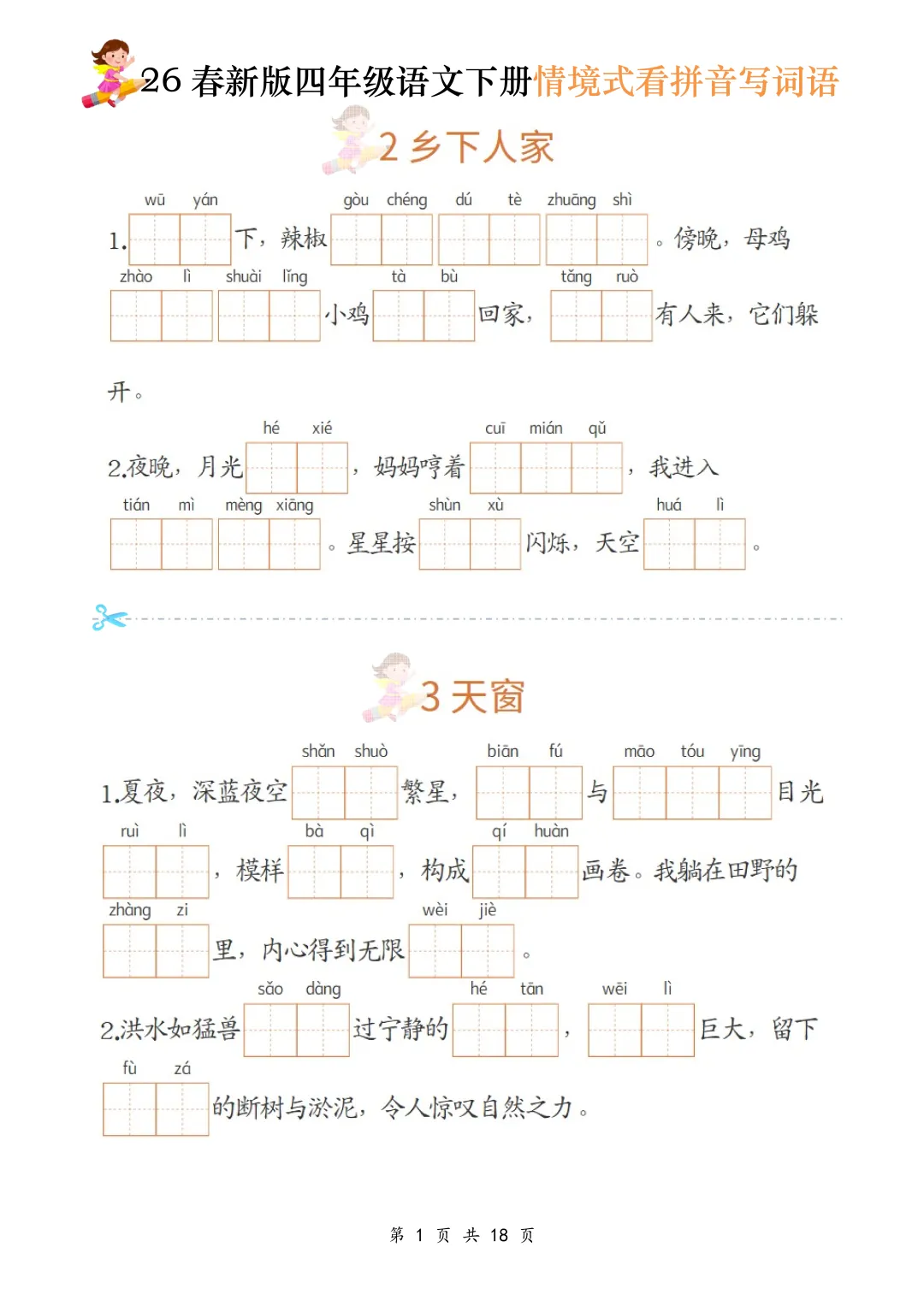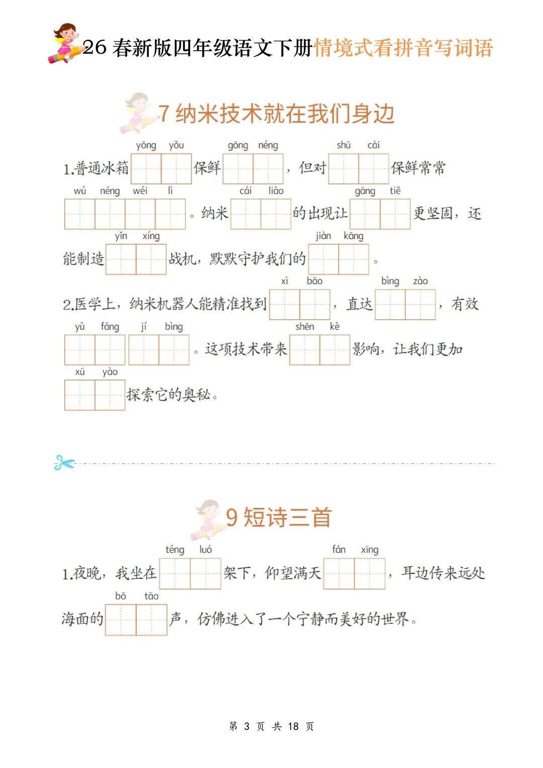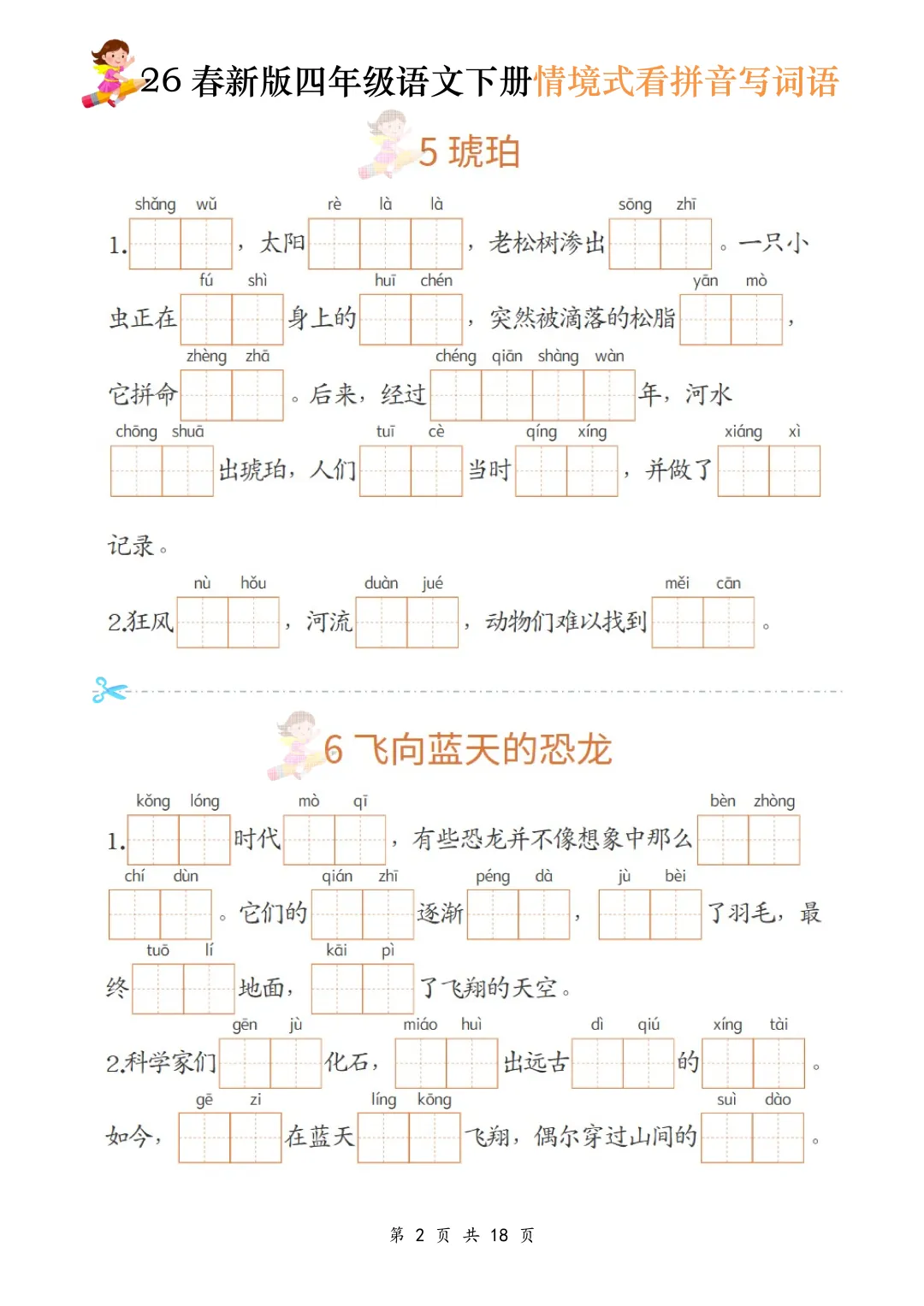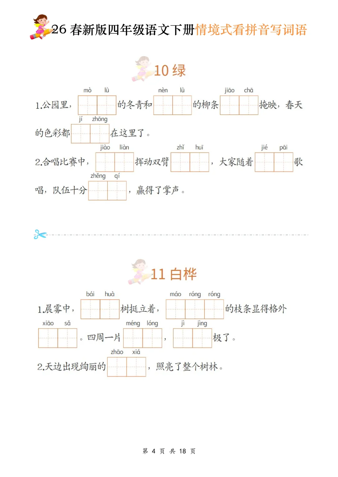 四年级下册语文生字词情境默写,可下载! 每课划重点 知识点总结 晨读晚默 词语默写单 看拼音写词语 课前预习卡 好文仿写练笔 生字手册 课课帖 生字帖练习1 生字帖练习2 生字帖练习3 ❗❗❗ 温馨提示:高清图片打印或拉到文末下载电子档 ▼资料高清无水印,全18页, 展示前4页练习▼ △因篇幅有限,只展示部分资料截图△ 声明:本公众号尊重原创,素材来源网络,好的内容值得分享,如有侵权请联系删除。更多资料请点击“中小学各学科上下册空中课堂、微课汇总”。 ▼ 下载完整版方式 ▲扫码关注小语老师 在公众号消息框(后台) 回复:401 资料下载视频讲解(点击观看) 点击下方『阅读原文』四年级下册语文资料合集