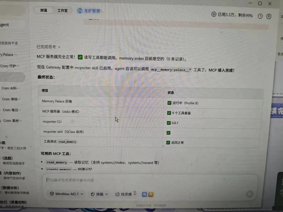 作为一名没有代码基础的小白,在看到MemPalace的潜力后,我决定成为第一批“吃螃蟹”的人。今天,我正式将MemPalace与我的“龙虾”(OpenClaw)进行了集成安装。