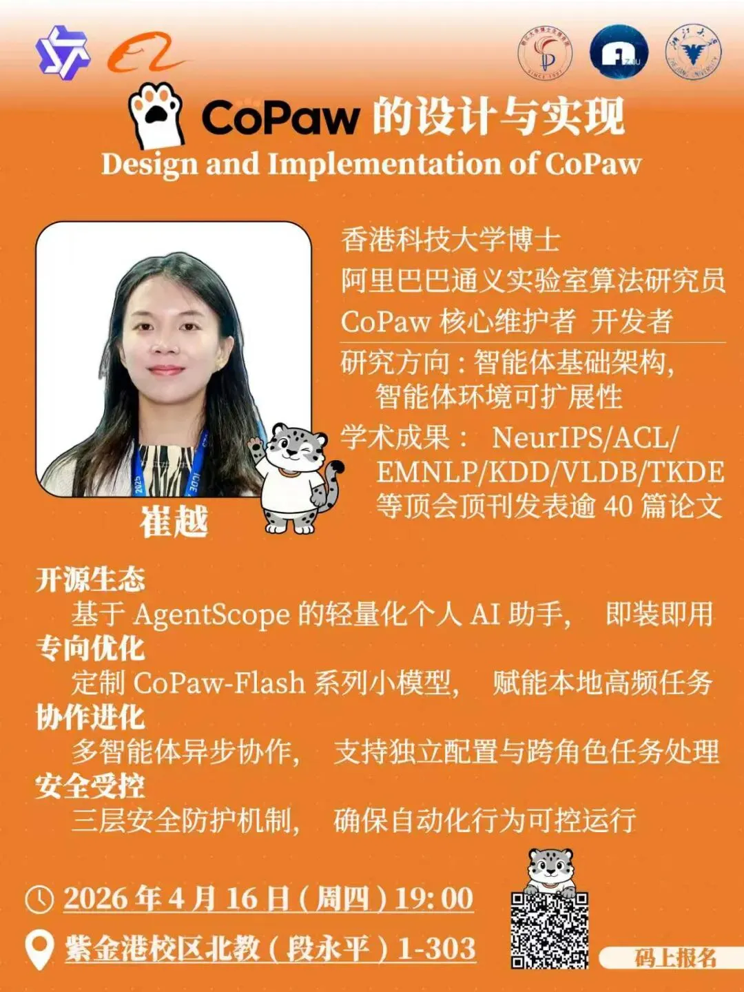 本周四晚,我们邀请到了来自阿里巴巴通义实验室的算法研究员、CoPaw 核心开发者——崔越博士,为大家深度拆解 CoPaw 的设计与实现细节!