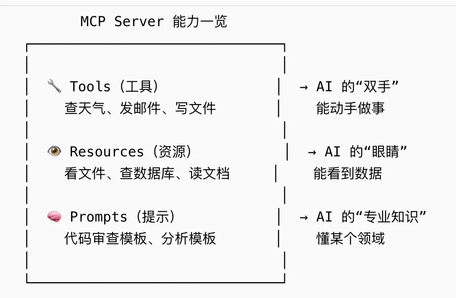 Resources(资源)– AI的”眼睛”让AI能 看到数据 :例子 :你问:“上个季度的销售数据怎么样?”AI通过MCP读取数据库,给你分析结果类比 :就像AI戴上了眼镜,能看你的文件和数据了 -