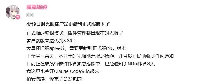 原因也很简单 —— 时光服这次彻底同步了正式服最新的 HUD 编辑模式,底层框架、API 全部重构,旧插件完全不兼容。