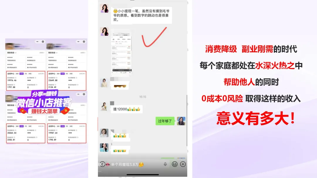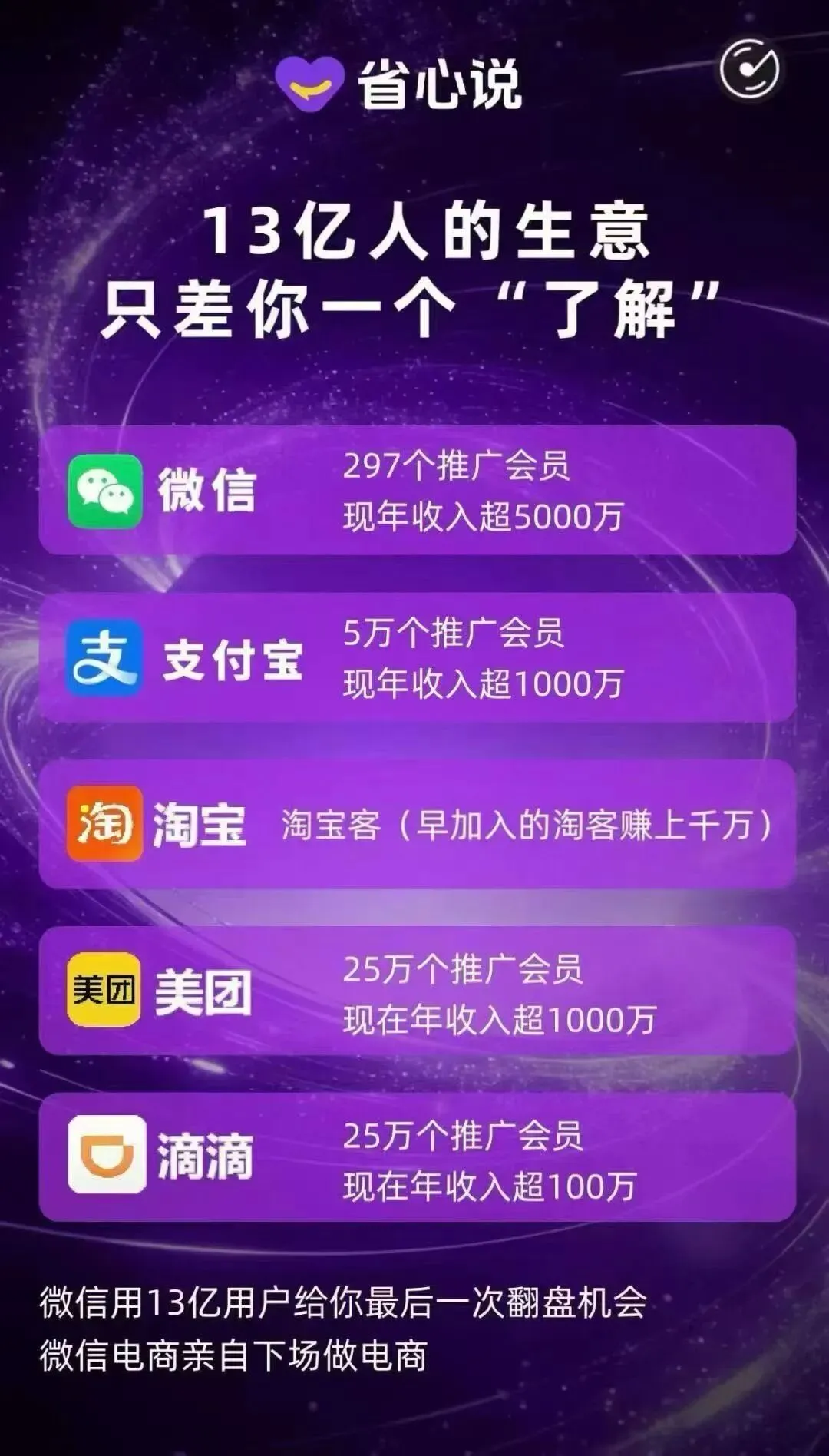 所以很多朋友说要创业,要找机会,要上班,那么去这些一线城市里面赚钱的机会很多,可能性也很大,但如果我们要想跟空间巨大的一个巨头来做生意,除了微信电商别无选择,没有第二个啊!可以看到微信每天的日活是所有的软件里面最高的,10点9亿。今天早上我看了最新数据是12.5亿,排名第二是淘宝,第三是抖音。每天有这么多的日活,每天有这么多的人在使用微信,每天有7.8亿人进入朋友圈,3.6亿人读取公众号,4亿人在使用小程序,微信给我们创造了一个非常大的一个流量池。在这里面我们保守估计一下微信电商,接下来在三年到五年,他会创造一个20万亿的市场。在这个里面私域和公域各占一半。曾经的淘客10万亿里面有45%有4.5万亿是淘客产生的。那么微信有20万亿的交易额体量的时候,有一半会是通过我们推客产生的, 算下来也是接近10万个亿,如果商品佣金按20%来算,这里面就是2万亿。所以未来三年到五年,2万个亿的佣金会给到推客,至于给到哪个推客,就要看谁看懂并且付诸行动了。推客机构是看到了这么大的一个机会和空间,就义无反顾的进来。全面转型做推客,我们其实准备了一年时间,在这一年时间里面也有很多的伙伴在我们平台拿到了非常不错的一些结果。我来给大家展示一部分真实的收入情况,咱们看到的都是日薪,2万多,一万多,大几千都有。但是这些收入对于我们现在的这些领导人和推客而言,他们的野心远不止于此。就像我们的秋老师说要把小数点去掉就是看到了这么大的一个机会和空间,就义无反顾的进来。全面转型做推客,我们其实准备了一年时间,在这一年时间里面也有很多的伙伴在我们平台拿到了非常不错的一些结果。我来给大家展示一部分真实的收入情况,咱们看到的都是日薪,2万多,一万多,大几千都有。但是这些收入对于我们现在的这些领导人和推客而言,他们的野心远不止于此。就像我们的秋老师说要把小数点去掉。t今天我们现场来的有没有品牌方,每一个人在这儿都能找到自己的位置。我们接下来是在跟微信合作做一件事情,做一个商业生态,整个商业生态里面一共只有五个身份,第一个身份是微信小店,微信小店是微信官方做基础建设和制定规则的。所有的商家要去卖货,首先得在微信里面去把微信小店开了。