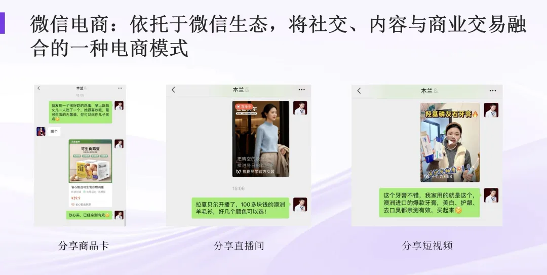 第二个身份商家或者达人,商家提供货品,达人提供内容。那么如果我们想要和微信做生意,商家就在这个里面提供优质的货品就可以了。机构说什么身份,是推客机构,帮助微信电商去招募推客。招募推客干嘛?招募推客来做全民分销,推客帮助微信小店去做分销。刚刚给大家晒的所有的收入,都是推客创造的,最后我们把商品分享给消费者,通过我们的朋友圈、社群、好友、直播间、短视频、商品卡的方式,最后完成消费的闭环。