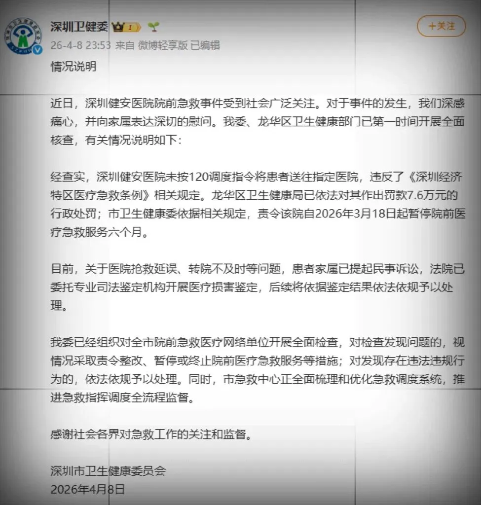 昨天深夜,深圳市发布情况说明,指出,经查实,深圳健安医院未按120调度指令将患者送往指定医院,违反了《深圳经济特区医疗急救条例》相关规定。龙华区卫生健康局已依法对其作出罚款7.6万元的行政处罚;市卫健委依据相关规定,责令该院自2026年3月18日起暂停院前医疗急救服务六个月。