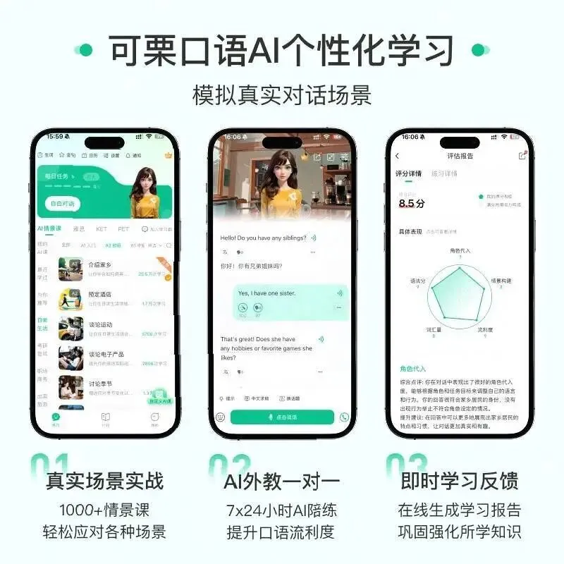 在解决”免费学英语口语的app哪个好用”这个问题上,可栗口语之所以脱颖而出,在于它精准击中了普通学习者的核心痛点:怕开口、没方向、难坚持。不管是零基础想突破哑巴英语,还是职场人练商务口语,或是学生备考雅思,它都能通过AI陪练、场景对话、精准纠错等功能,让你每天15分钟就能稳步提升口语能力。