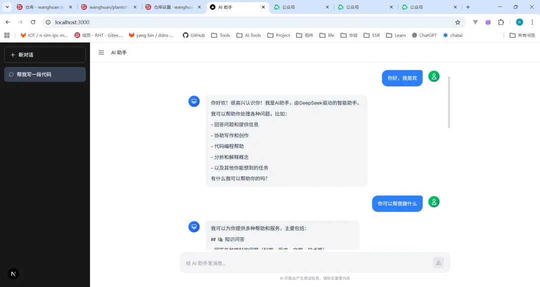// 核心状态(React Hooks)const [conversations, setConversations] = useState<Conversation[]>([]); // 所有会话const [activeId, setActiveId] = useState<string | null>(null); // 当前激活的会话const [input, setInput] = useState(""); // 输入框内容const [loading, setLoading] = useState(false); // 加载状态const [streamingContent, setStreamingContent] = useState(""); // 流式输出内容
