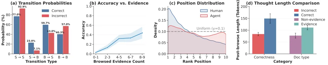 智能体不是每次搜索都会浏览文档。数据分析显示,成功完成任务的轨迹(最终答案正确)与失败的轨迹(答案错误)在行为上有显著差异。
