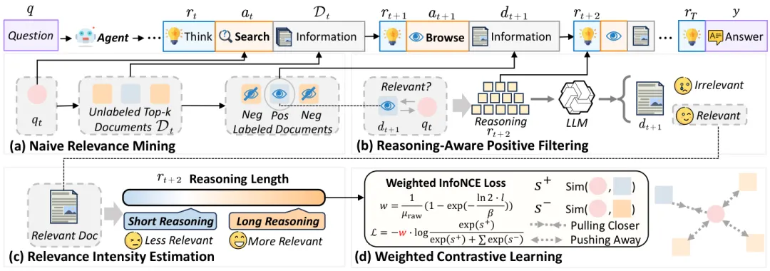 基于以上三大发现,研究团队提出了 LRAT 框架。它的核心思想是:从智能体轨迹中自动化地挖掘高质量、带权重的训练数据,用来微调检索模型。整个过程如同一个精炼厂,将原始的交互“矿石”提炼成监督学习的“燃油”。