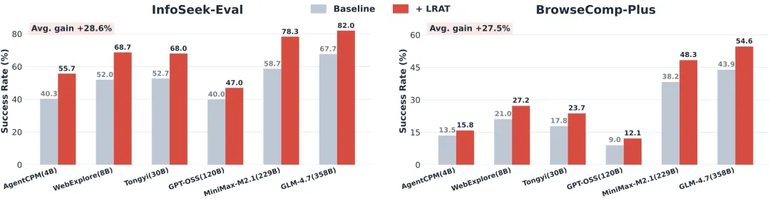 论文在InfoSeek-Eval(域内)和BrowseComp-Plus(域外)两个深度研究基准上,对LRAT进行了全面评估。他们测试了多种检索模型(Qwen3-Embedding, E5-Large)和多种智能体(从4B的AgentCPM到358B的GLM-4.7),结果令人振奋。