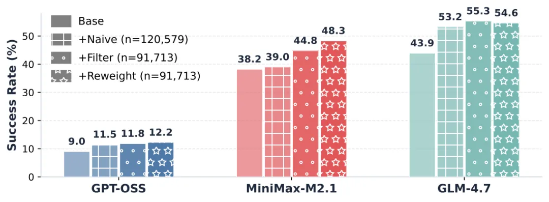 更关键的是,任务成功率与浏览过的证据文档数量呈强正相关,而从未浏览过任何文档的轨迹,成功率直接降为0。这说明,对于智能体而言,浏览不是可选项,而是完成任务的关键步骤。因此,被智能体浏览过的文档,天然就是潜在的“正面样本”候选。