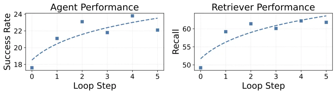 论文通过模拟实验证实了这个飞轮是可行的。即使使用包含失败任务的轨迹,也能有效提升检索器。在模拟的多轮迭代中,智能体成功率和检索召回率均实现了稳定、持续的提升。