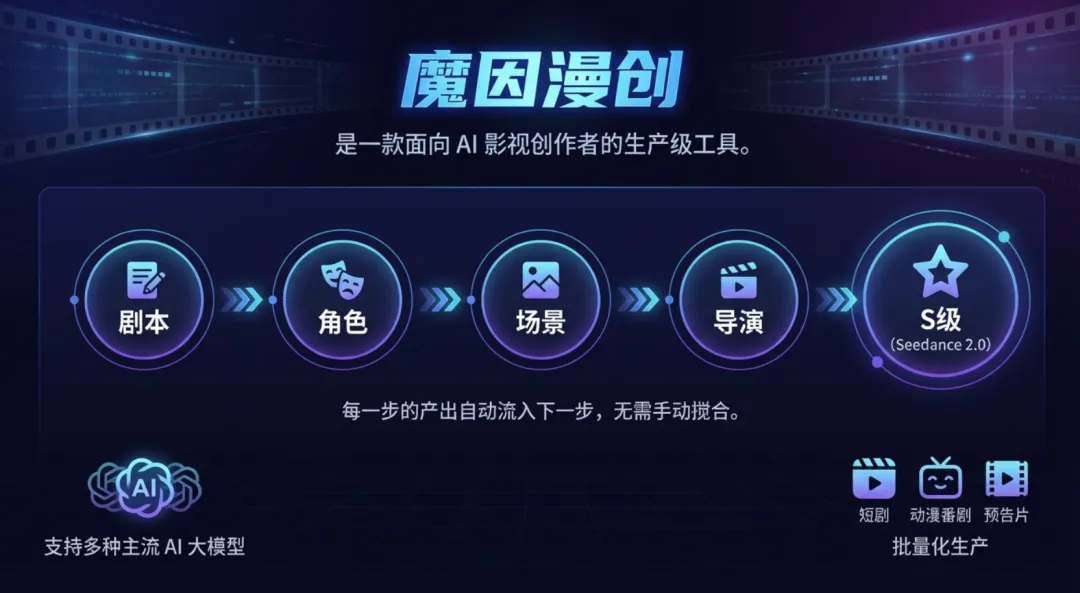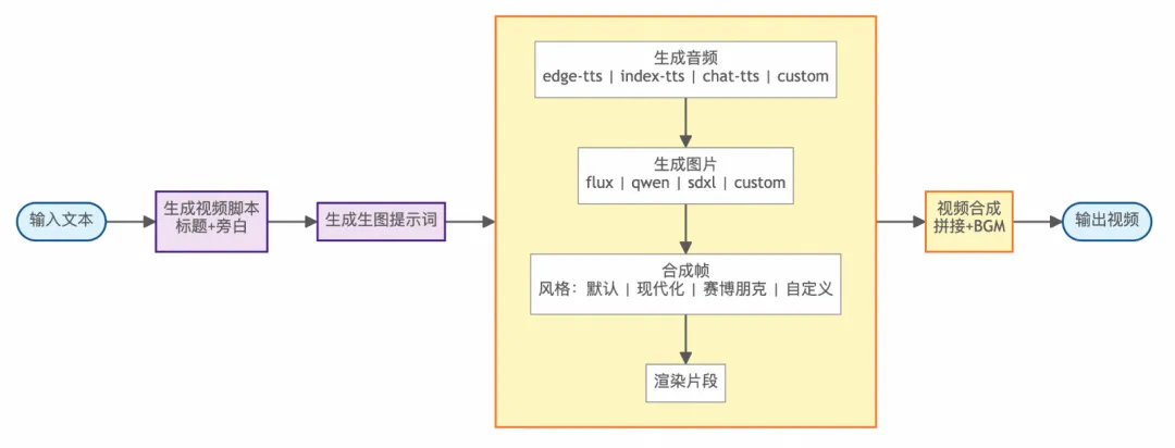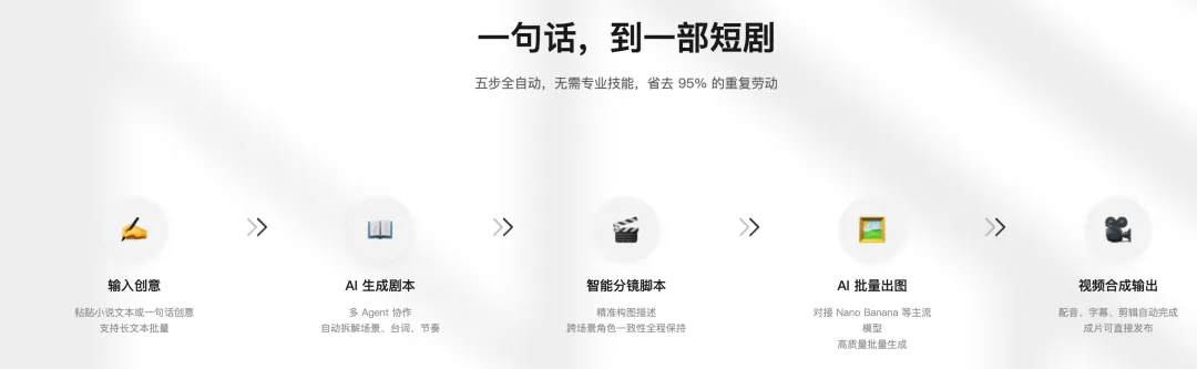 剧本解析 → 角色一致性 → 场景生成 → 分镜 → 成片 -