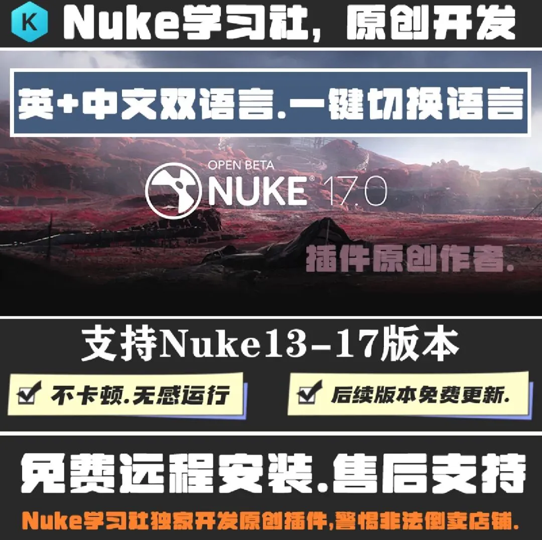 Nuke 17 版本深度兼容: 全面支持 Nuke 17,包含新增的 58 个三维节点以及顶部工具栏 Fild 菜单内新节点的双语言支持 。